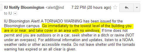 Confusion. Last night got a little squirrely because IU sent messages telling everyone to seek shelter for the first warning, but for the second warning, some messages told people that campus was not being impacted. For once, the polygon seemed to matter! This should happen in every event. This should become the standard and not the exception. (For the record, it’s the first time in my 3 years of living here that I’ve seen this happen.)