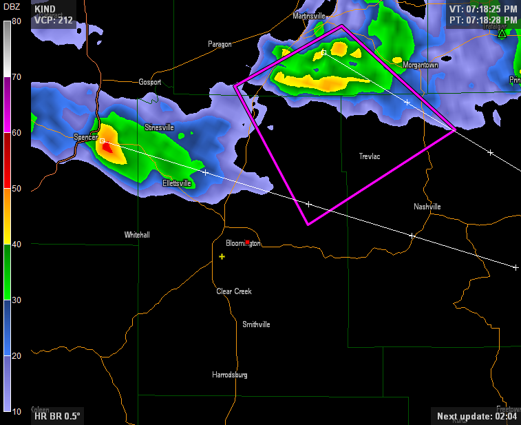 By the way, the sirens went off twice in Bloomington last night. The second time was for a storm that was forecast to clip the northeastern part of Monroe County. Here’s the radar and tornado warning polygon for the second one: